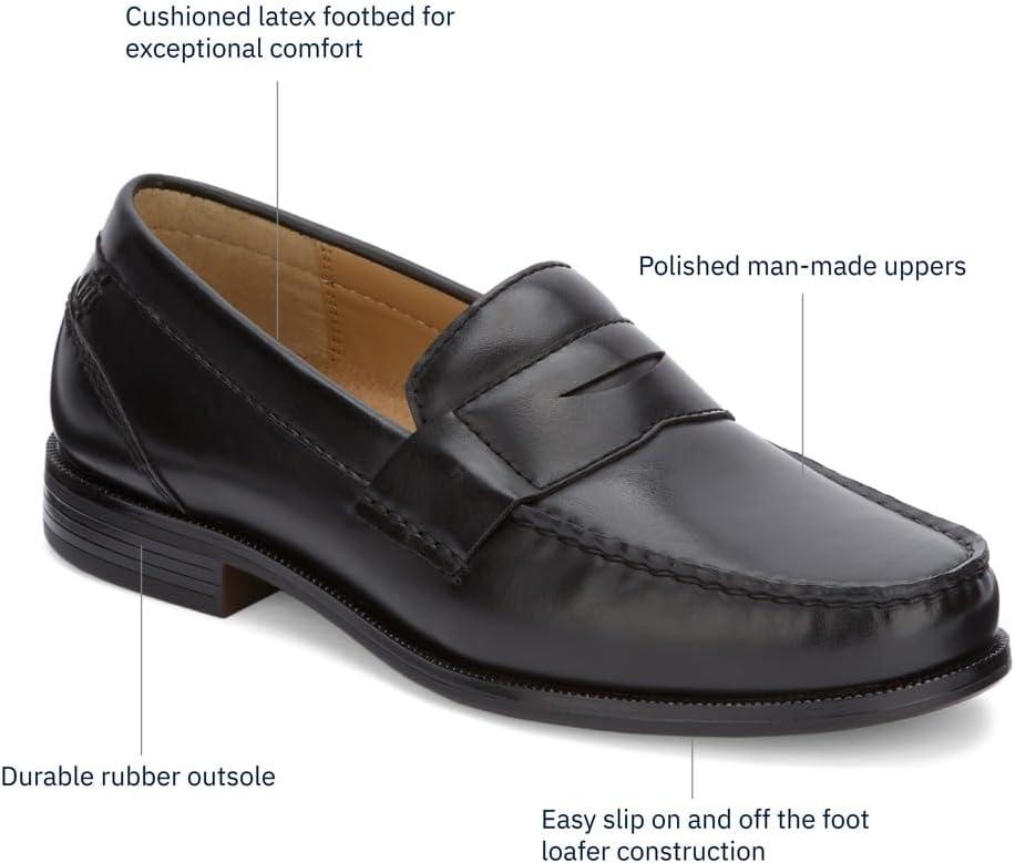 Elevate your style with these classic Dockers dress shoes. Styled with the traditional penny loafer silhouette and classic strap these men’s loafers have been upgraded to add comfort and class to any look. Crafted by hand these synthetic leather loafers are easy to slide on and off while the extra cushioned footbed and rubber outsole create all-day support and comfort.
