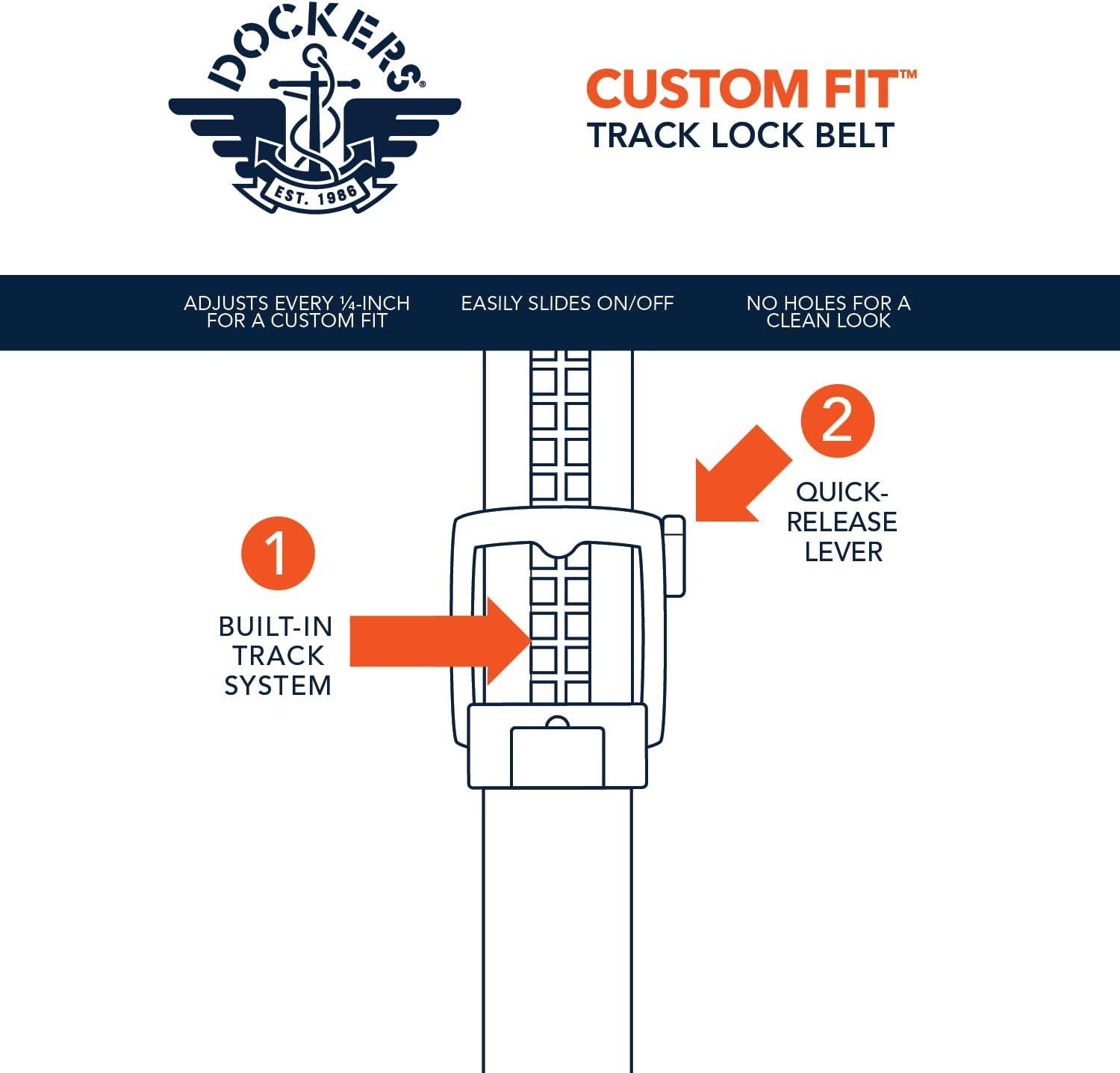 An essential accessory in every man's wardrobe, this Dockers men's belt will feel secure and comfortable for all-day wear. Crafted with Custom Fit technology, Dockers custom fit belts are engineered for comfort. Choose from two design options: Track Lock Technology belts with quick release buckles that adjust every 1/4 inch or Pressure Locking buckle belts with compression technology. Both options provide endless adjustability and comfort with a modern, no-holes strap for a clean look. Designed by Dockers® with our usual attention to detail, innovation, and timeless style, Dockers belts are sure to complete you look in style.