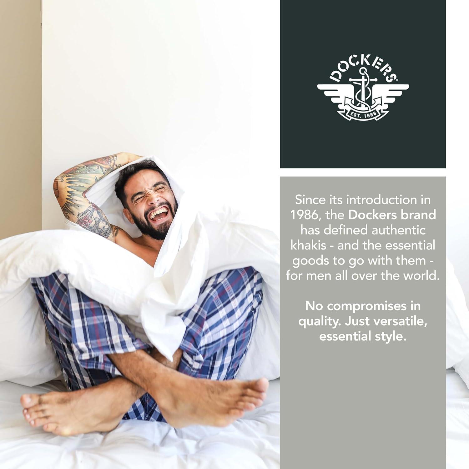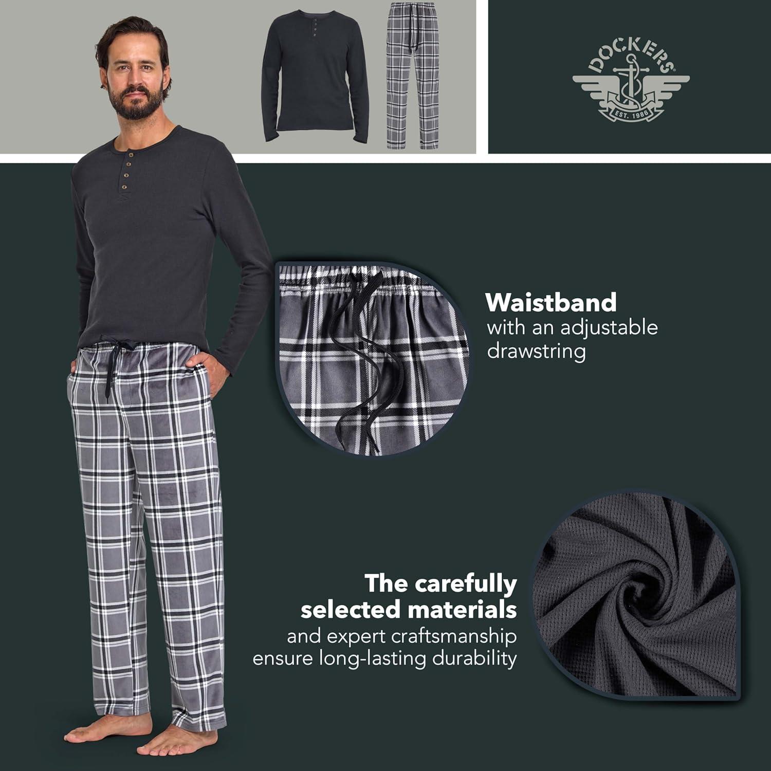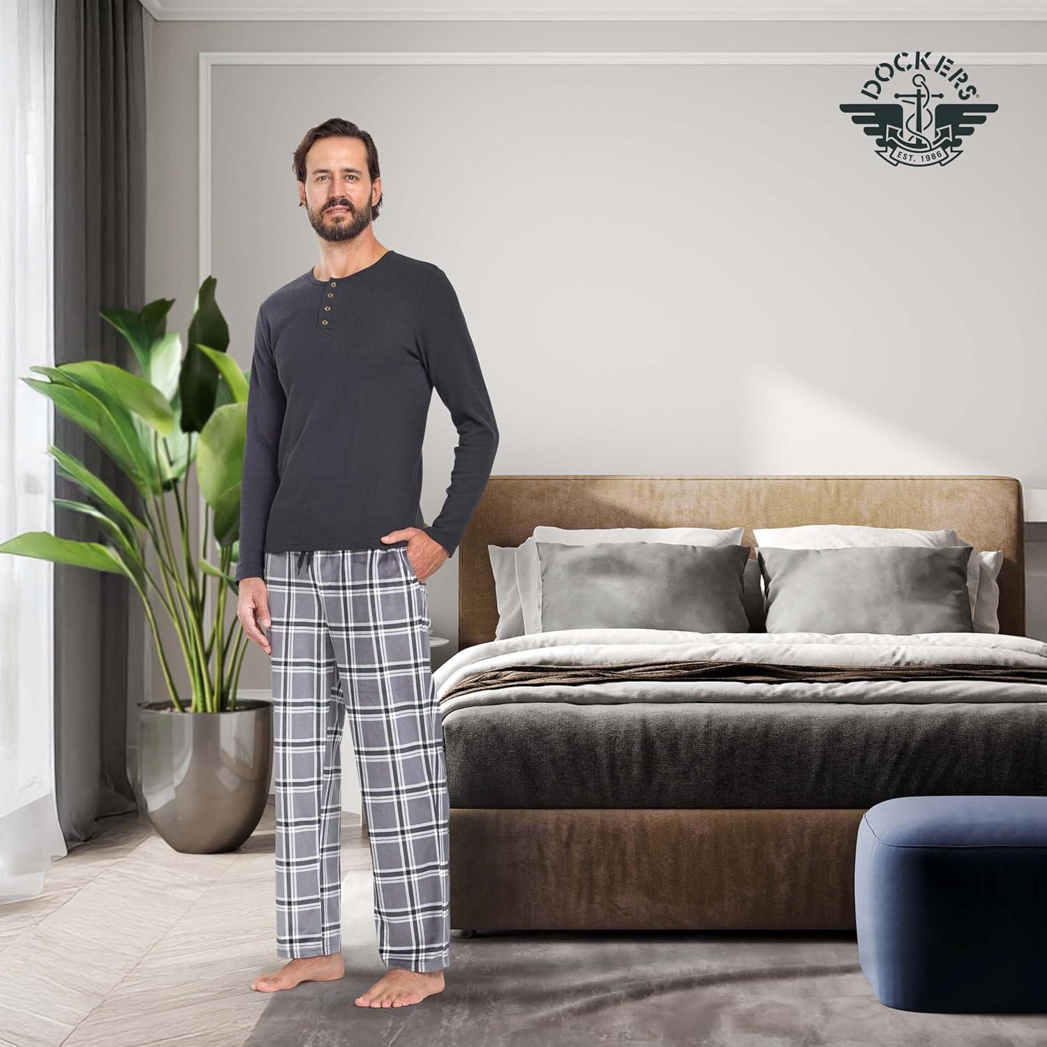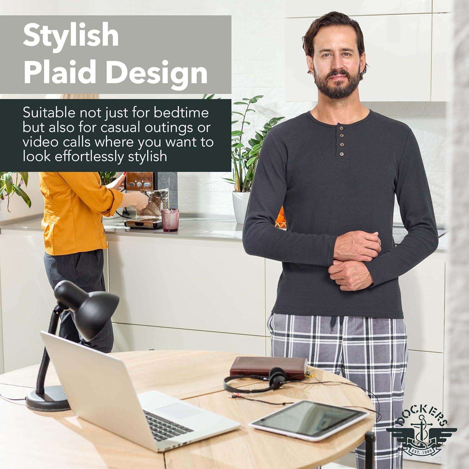 DOCKERS Men’s Pajama Sets, Plaid PJ Pants for Men Lounge Set Long Sleeve Shirt Plaid Bottoms(Black/Grey)