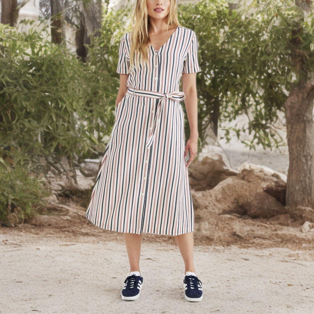 A midi dress made in sustainably soft TENCEL™ LYOCELL fabric — sourced from sustainably harvested wood — we thought through every detail of this classic, from the easy v-neck to collar to the lightly gathered elasticized waist to the on-seam pockets.