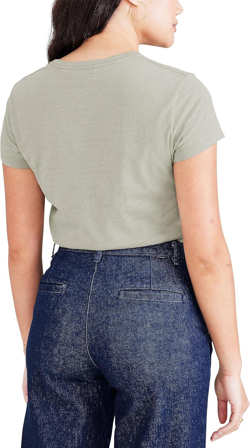 Dockers Women’s Slim Short Sleeve Graphic Tee Shirt(Forest Fog – Navy Blazer Dockers Script)